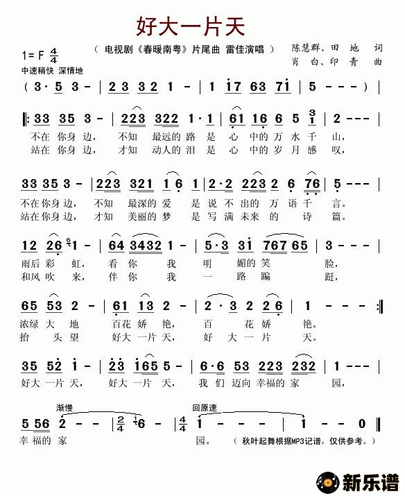 雷佳演唱的好大一片天(电视剧《春暖南粤》片尾曲)歌词,好大一片天(电视剧《春暖南粤》片尾曲)最新曲谱.