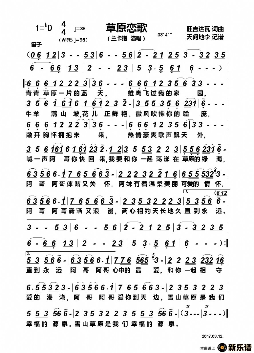 兰卡措演唱的草原恋歌歌词,草原恋歌最新曲谱.