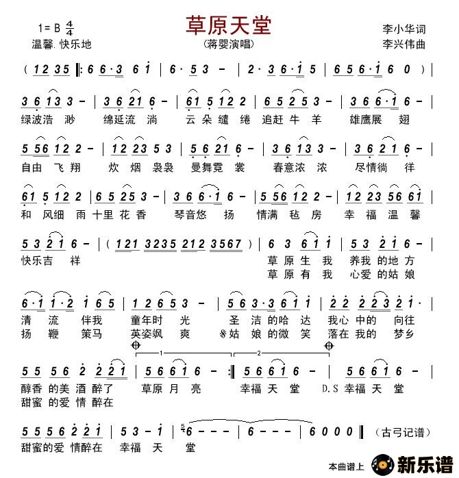 蒋婴演唱的草原天堂歌词,草原天堂最新曲谱.