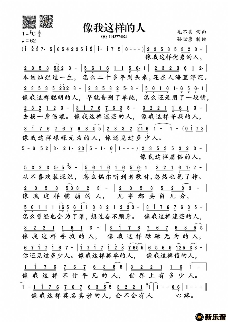 毛不易演唱的像我这样的人歌词,像我这样的人最新曲谱.
