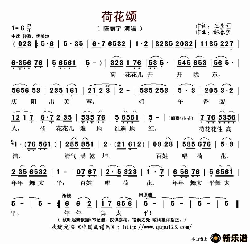陈丽宇演唱的荷花颂歌词,荷花颂最新曲谱.