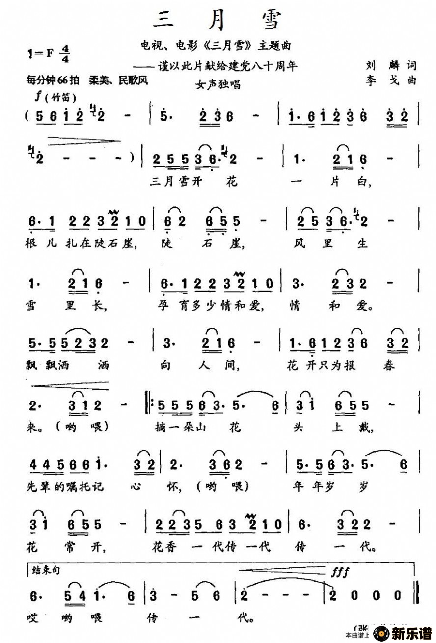 三月雪(谨以此片献给建党八十周年)(电视、电影《三月雪》插曲)张晓莹 张晓莹演唱的三月雪(谨以此片献给建党八十周年)(电视、电影《三月雪》插曲)歌词,三月雪(谨以此片献给建党八十周年)(电视、电影《三月雪》插曲)最新曲谱.