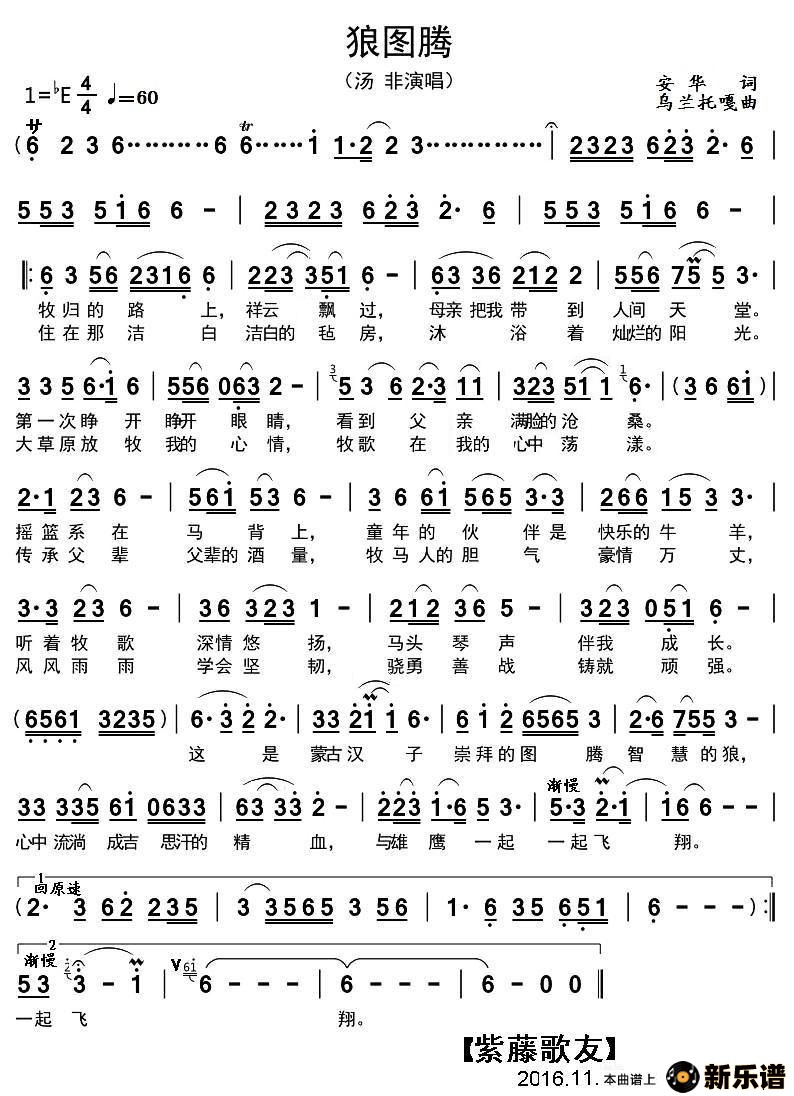 汤非演唱的狼图腾歌词,狼图腾最新曲谱.
