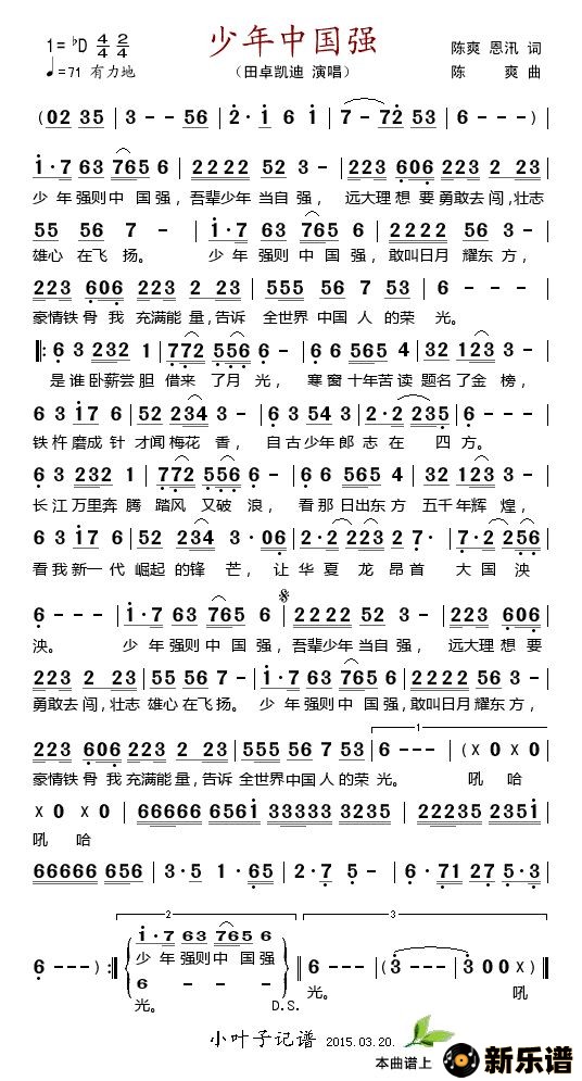 田卓凯迪演唱的少年中国强 歌词,少年中国强 最新曲谱.