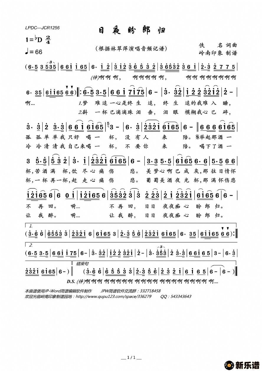 《日夜盼郎归》最新曲谱 林翠萍-岭南印象制谱