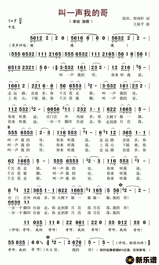 《叫一声我的哥》最新曲谱 李琼