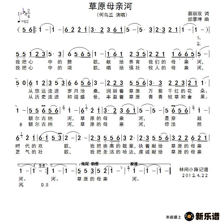 何乌兰演唱的草原的母亲河歌词,草原的母亲河最新曲谱.