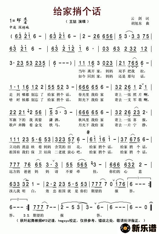王喆演唱的给家捎个话歌词,给家捎个话最新曲谱.