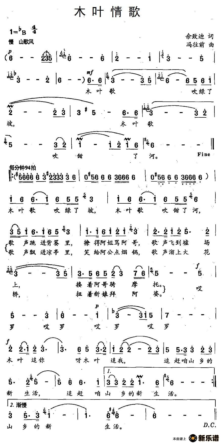演唱的木叶情歌歌词,木叶情歌最新曲谱.