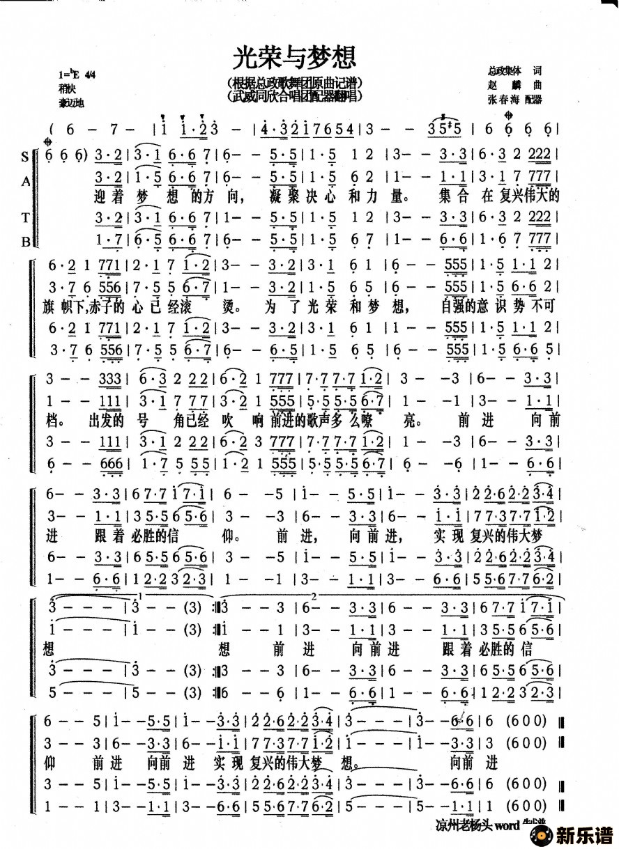 武威同欣合唱团演唱的光荣与梦想歌词,光荣与梦想最新曲谱.