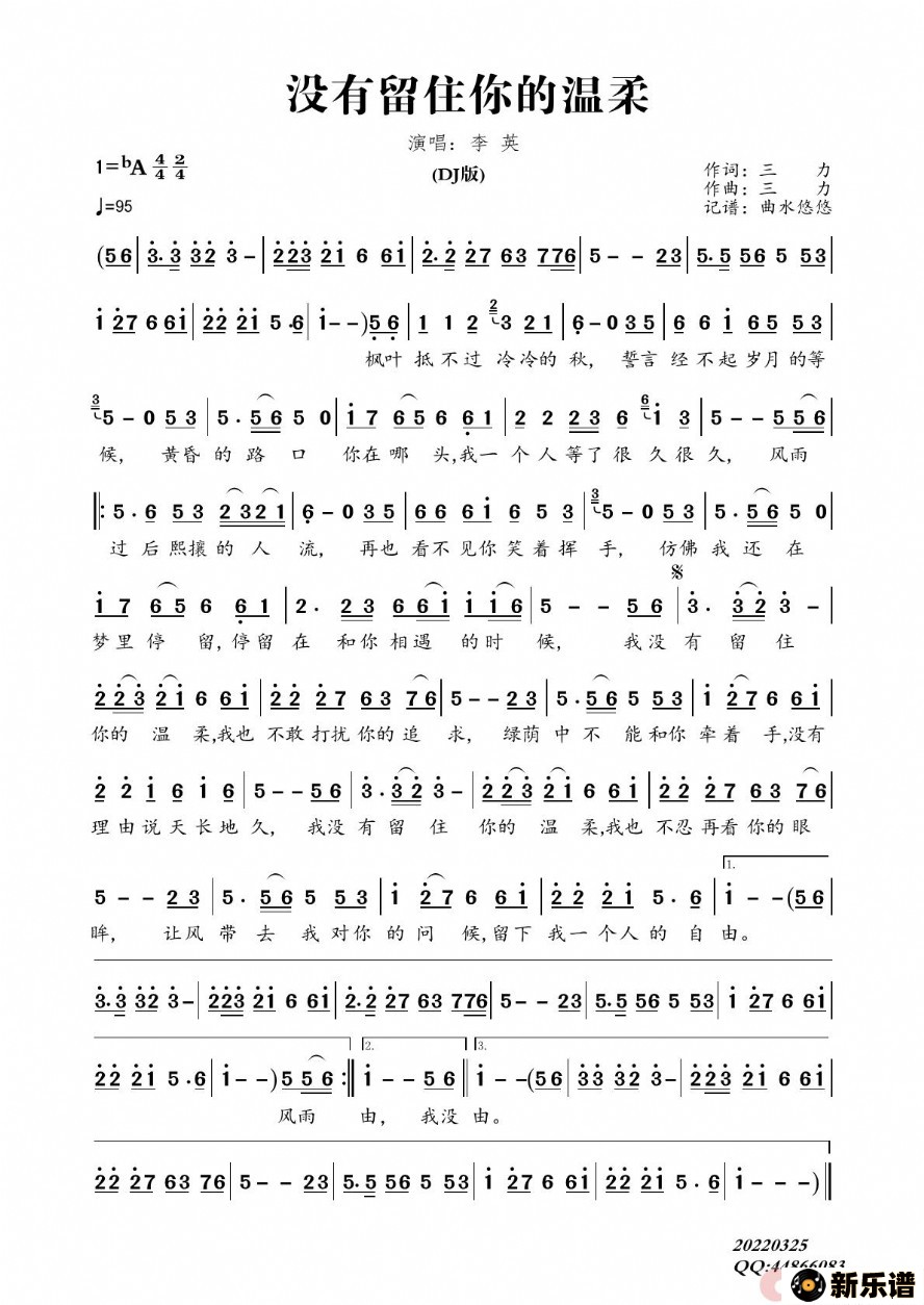 《没有留住你的温柔》最新曲谱 李英-曲水悠悠制谱