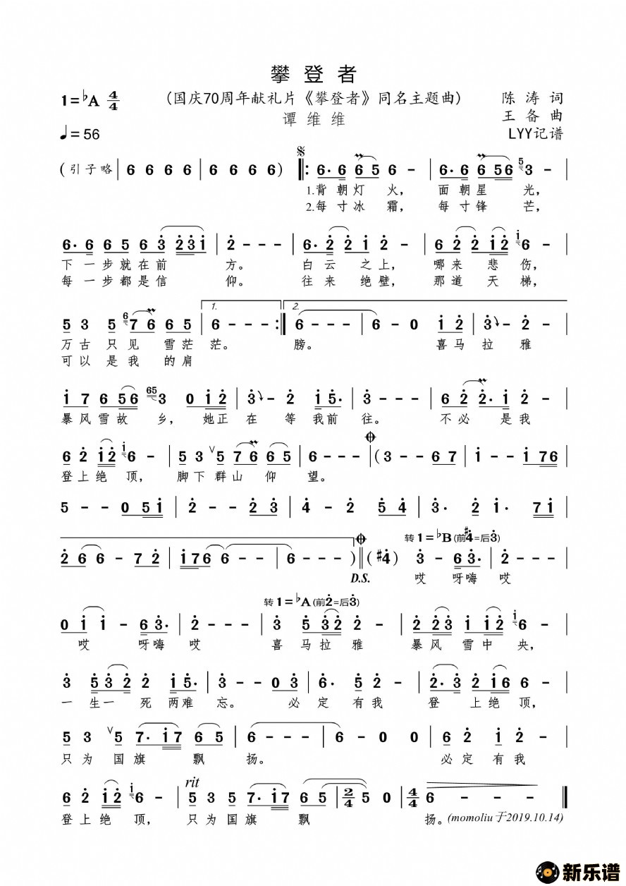 攀登者(同名电影主题曲)(陈涛词 王备曲)谭维维 谭维维演唱的攀登者(同名电影主题曲)(陈涛词 王备曲)歌词,攀登者(同名电影主题曲)(陈涛词 王备曲)最新曲谱. 此最新曲谱由新乐谱会员 momoliu 上传