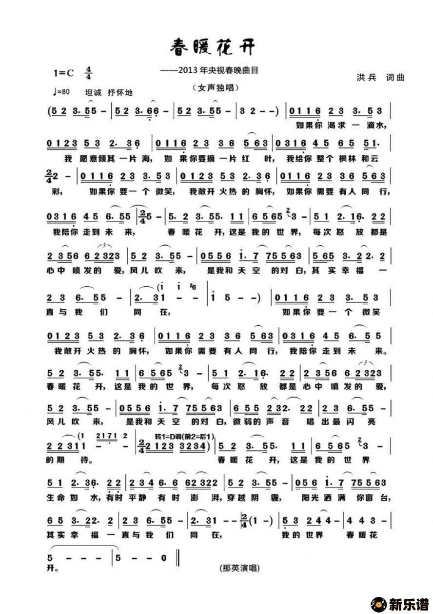 那英演唱的春暖花开歌词,春暖花开最新曲谱.