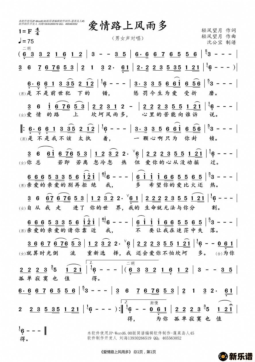 《爱情路上风雨多》最新曲谱 -沈公宝制谱