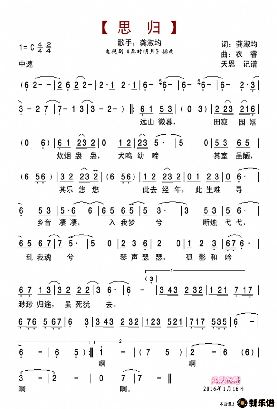 龚淑均演唱的思归(电视剧《秦时明月》插曲)歌词,思归(电视剧《秦时明月》插曲)最新曲谱.