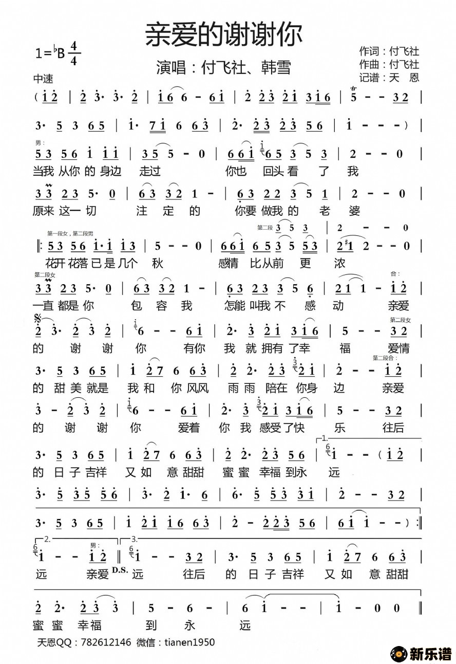《亲爱的谢谢你》最新曲谱 付飞社、韩雪-天恩制谱