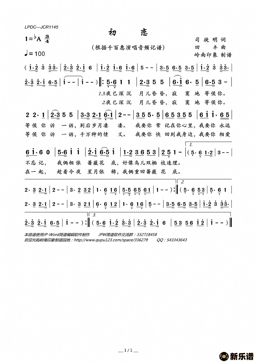 《初恋》最新曲谱 千百惠-岭南印象制谱