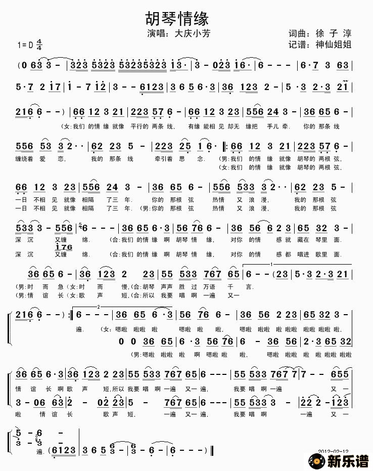 大庆小芳演唱的胡琴情缘歌词,胡琴情缘最新曲谱.