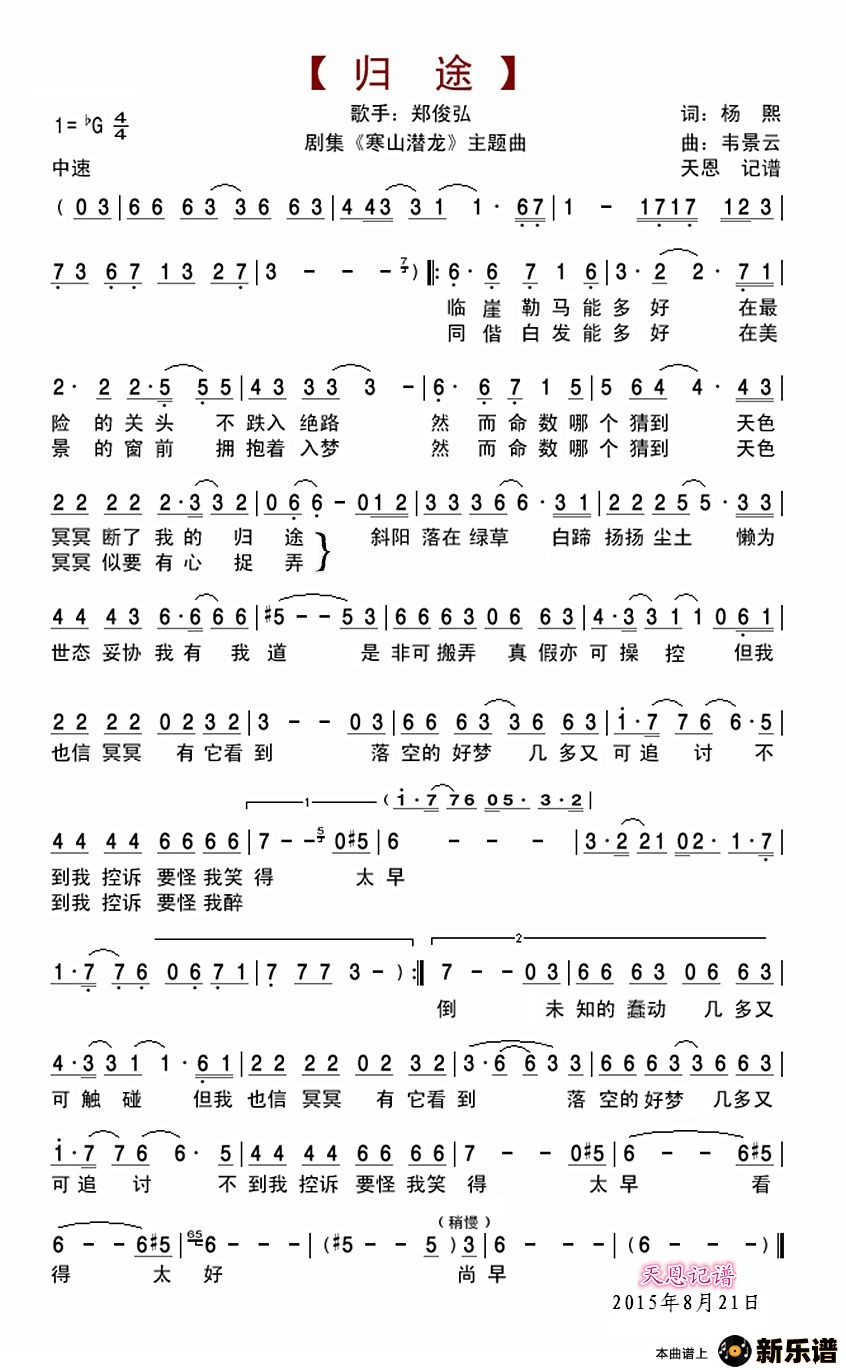 郑俊弘演唱的归途(寒山潜龙主题曲)歌词,归途(寒山潜龙主题曲)最新曲谱.