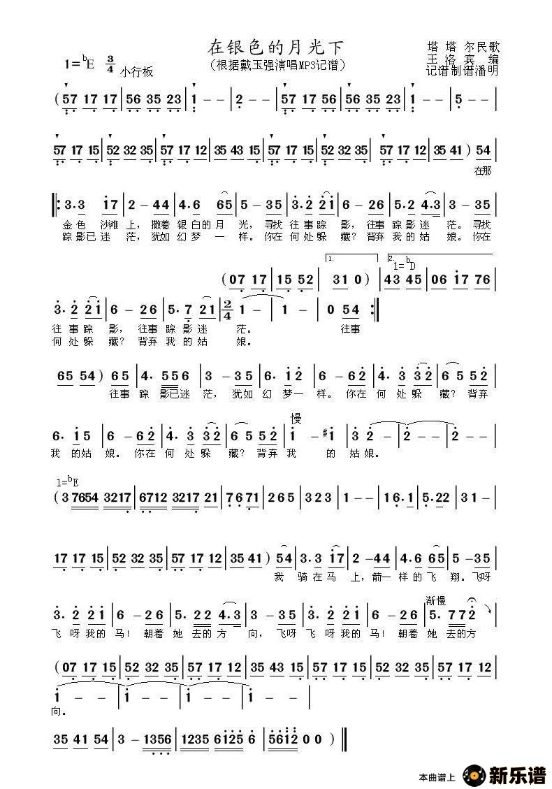 戴玉强演唱的在银色的月光下歌词,在银色的月光下最新曲谱.