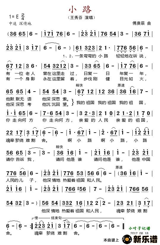 王秀芬演唱的小路歌词,小路最新曲谱.