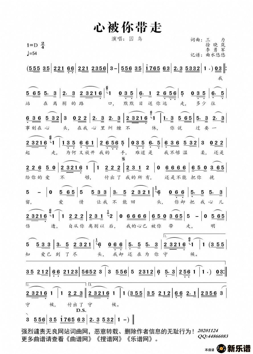 《心被你带走》最新曲谱 囚鸟-曲水悠悠制谱