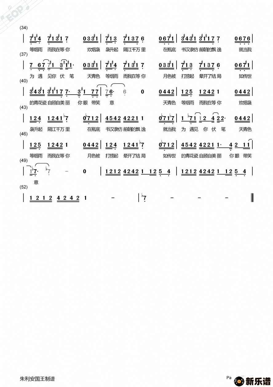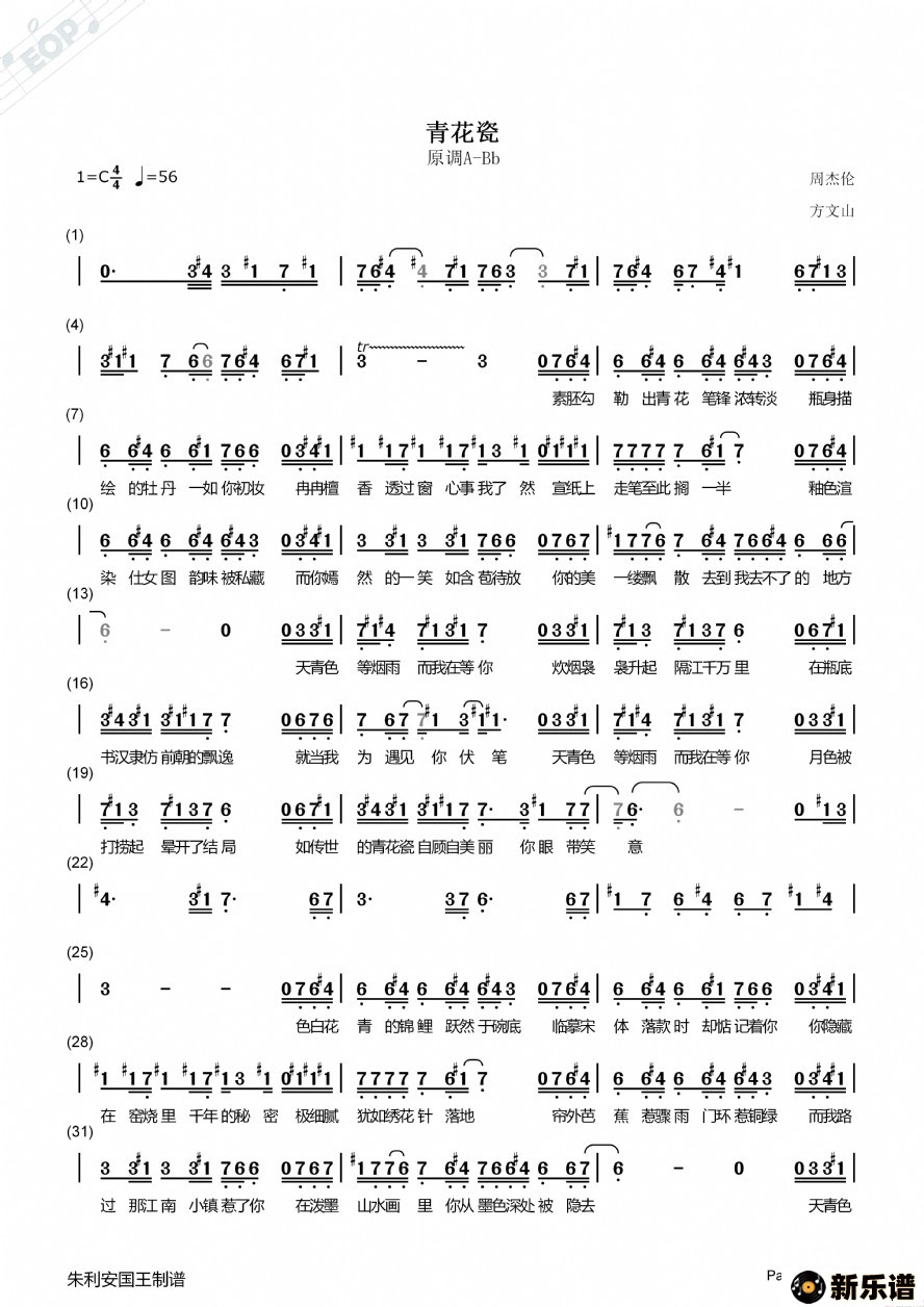 《青花瓷 c调转调》最新曲谱 周杰伦