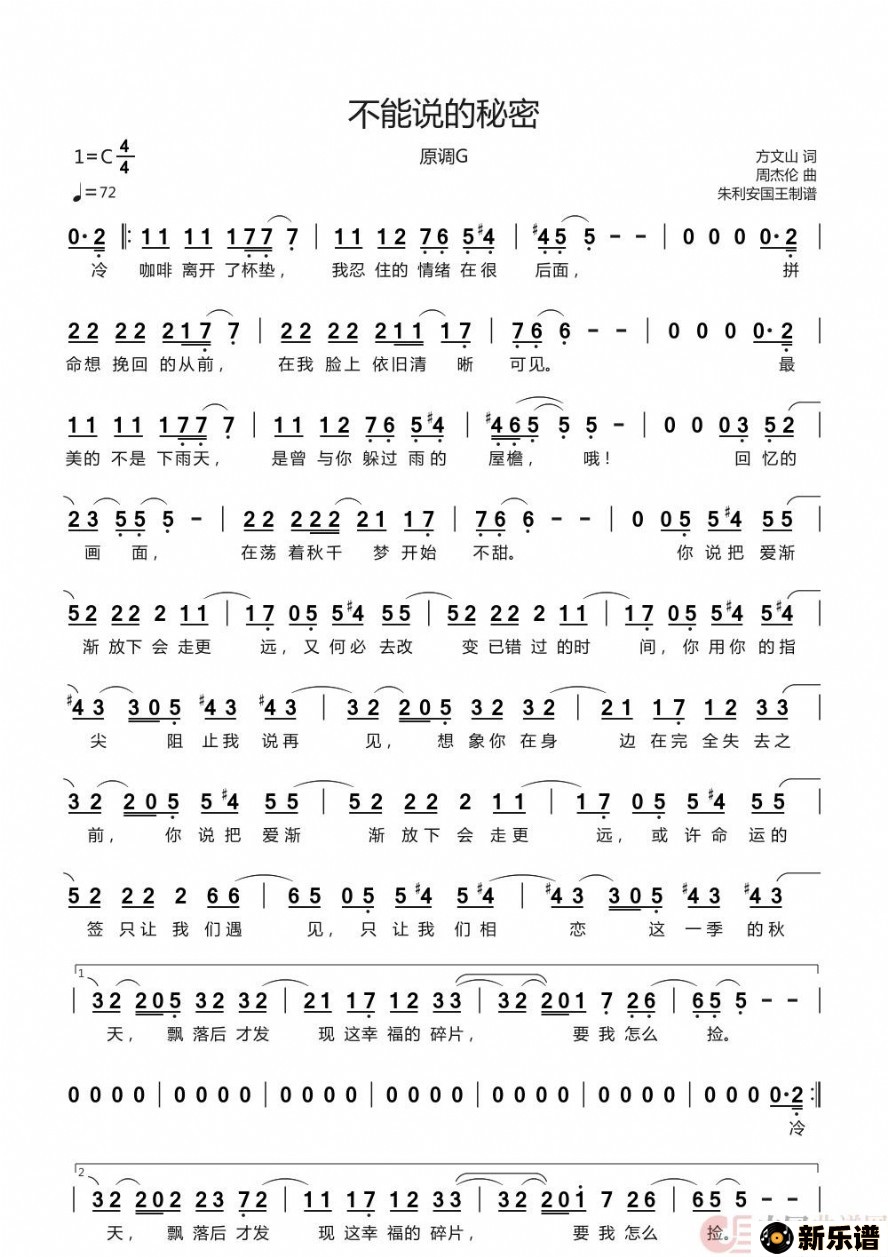《不能说的秘密 c调转调》最新曲谱 周杰伦