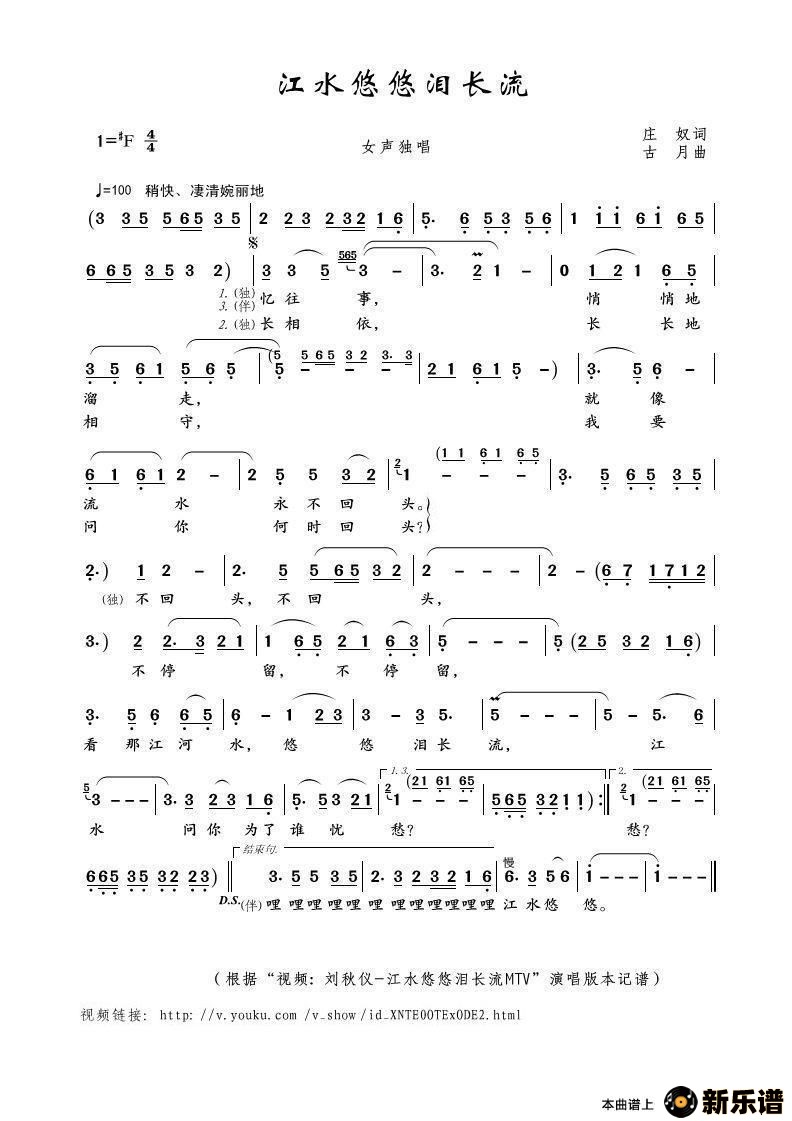 刘秋仪演唱的江水悠悠泪长流歌词,江水悠悠泪长流最新曲谱.
