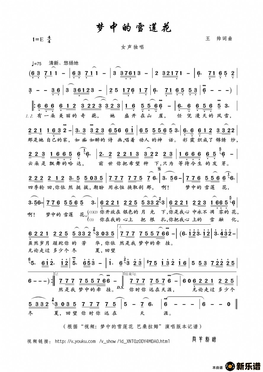 《梦中的雪莲花》最新曲谱 巴桑拉姆-君羊制谱