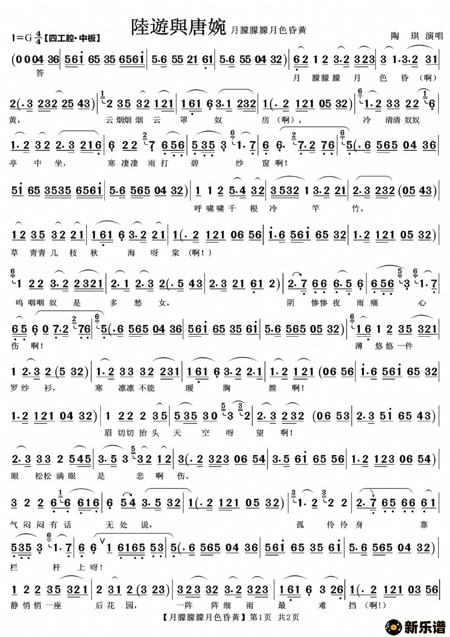 月朦朦朦月色昏黄/ 陆游与唐婉唱段 相关曲谱