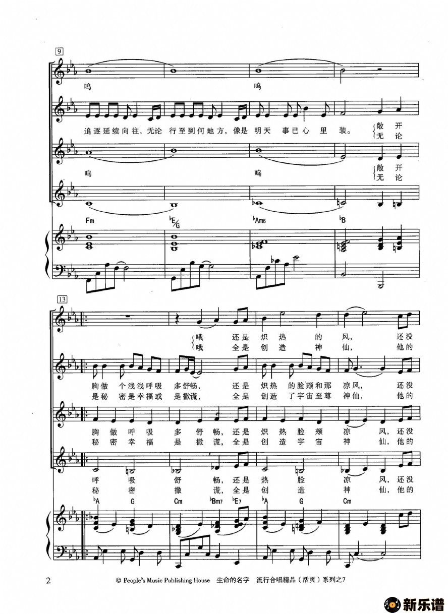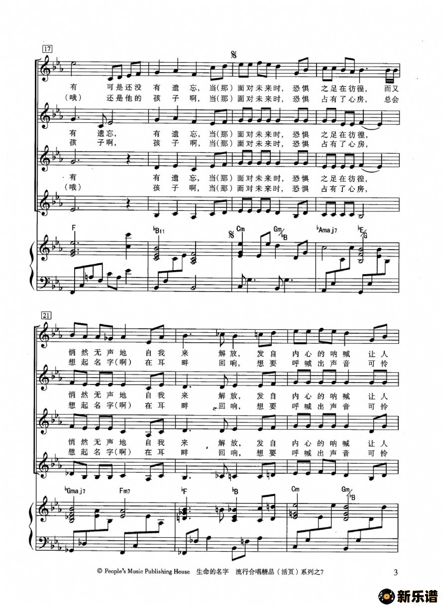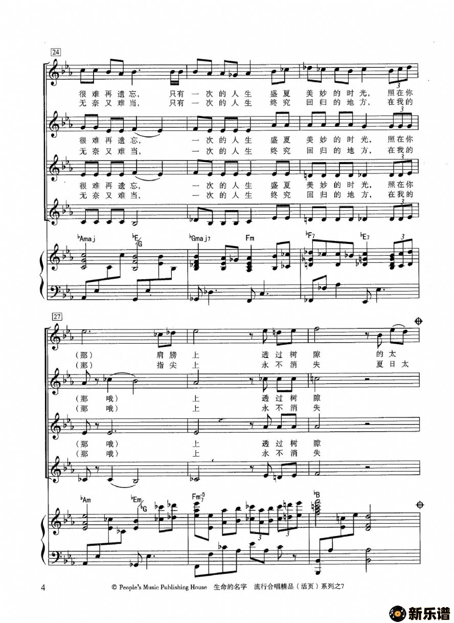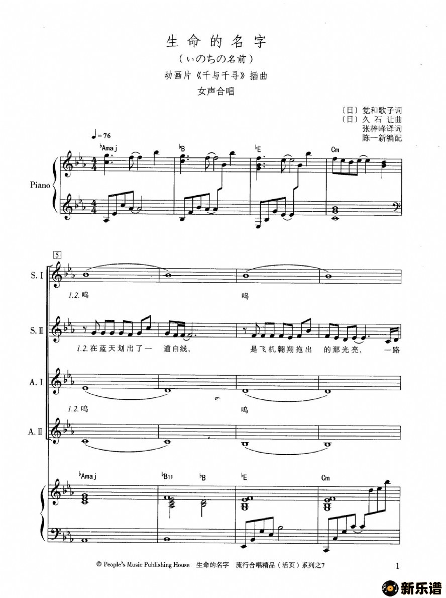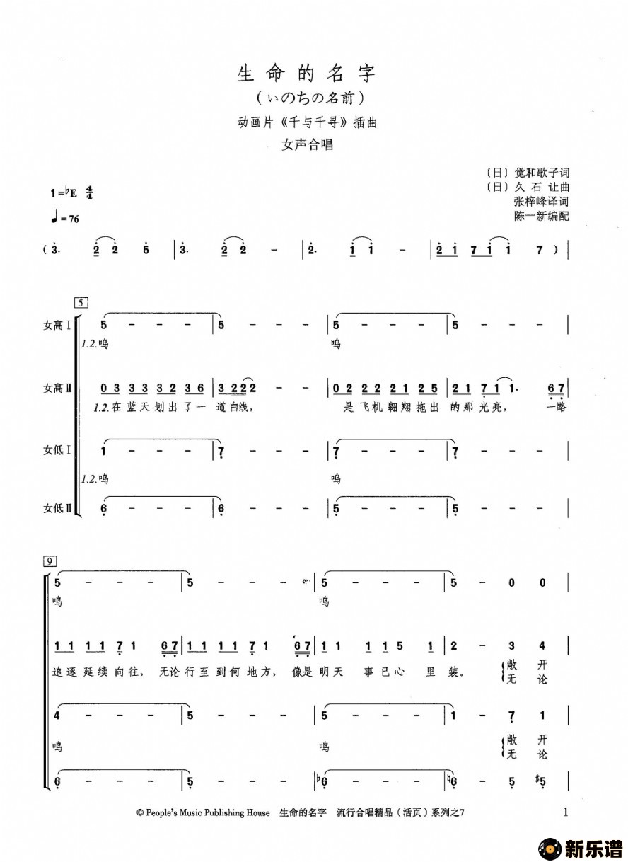 《生命的名字(千与千寻插曲)》最新曲谱 女生和唱