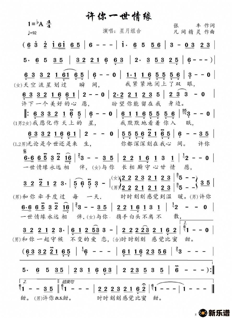《许你一世情缘》最新曲谱 星月组合