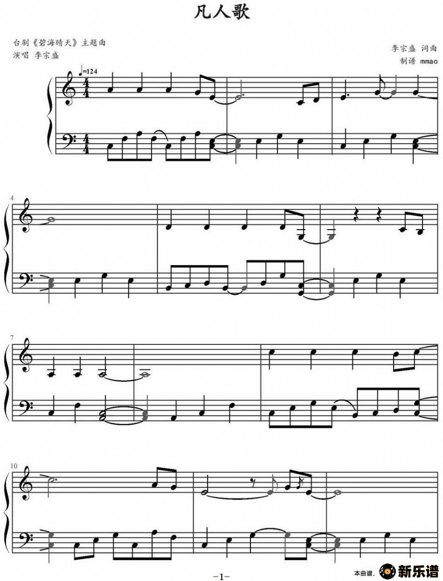 演唱的凡人歌歌词,凡人歌最新曲谱.