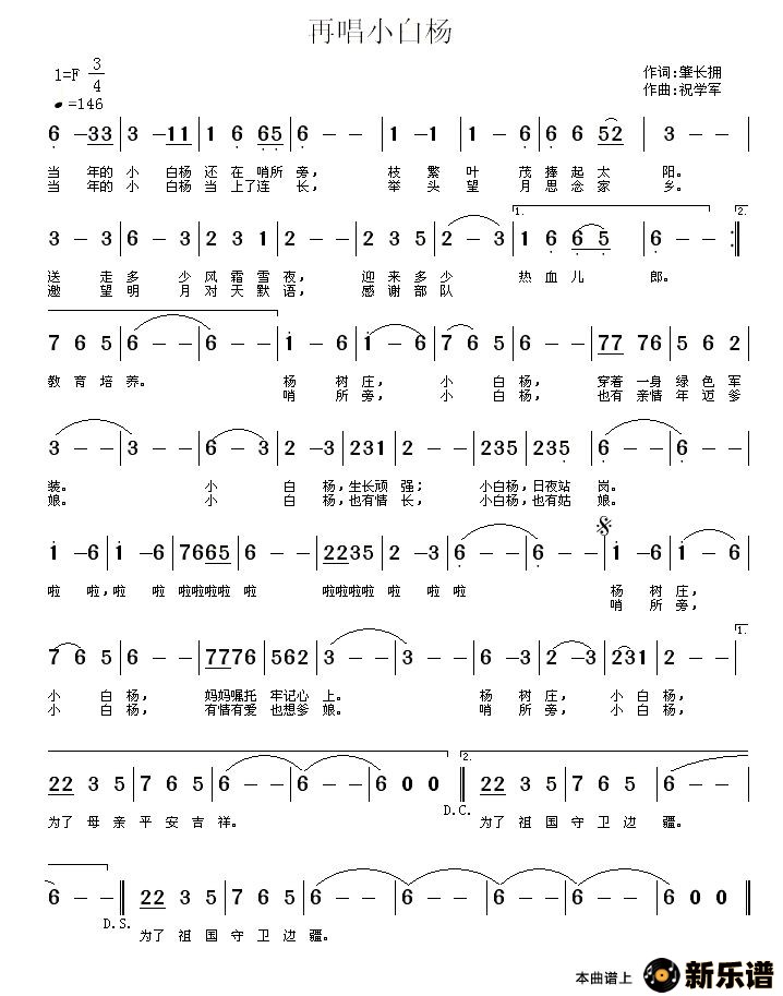 祝学军演唱的再唱小白杨歌词,再唱小白杨最新曲谱.
