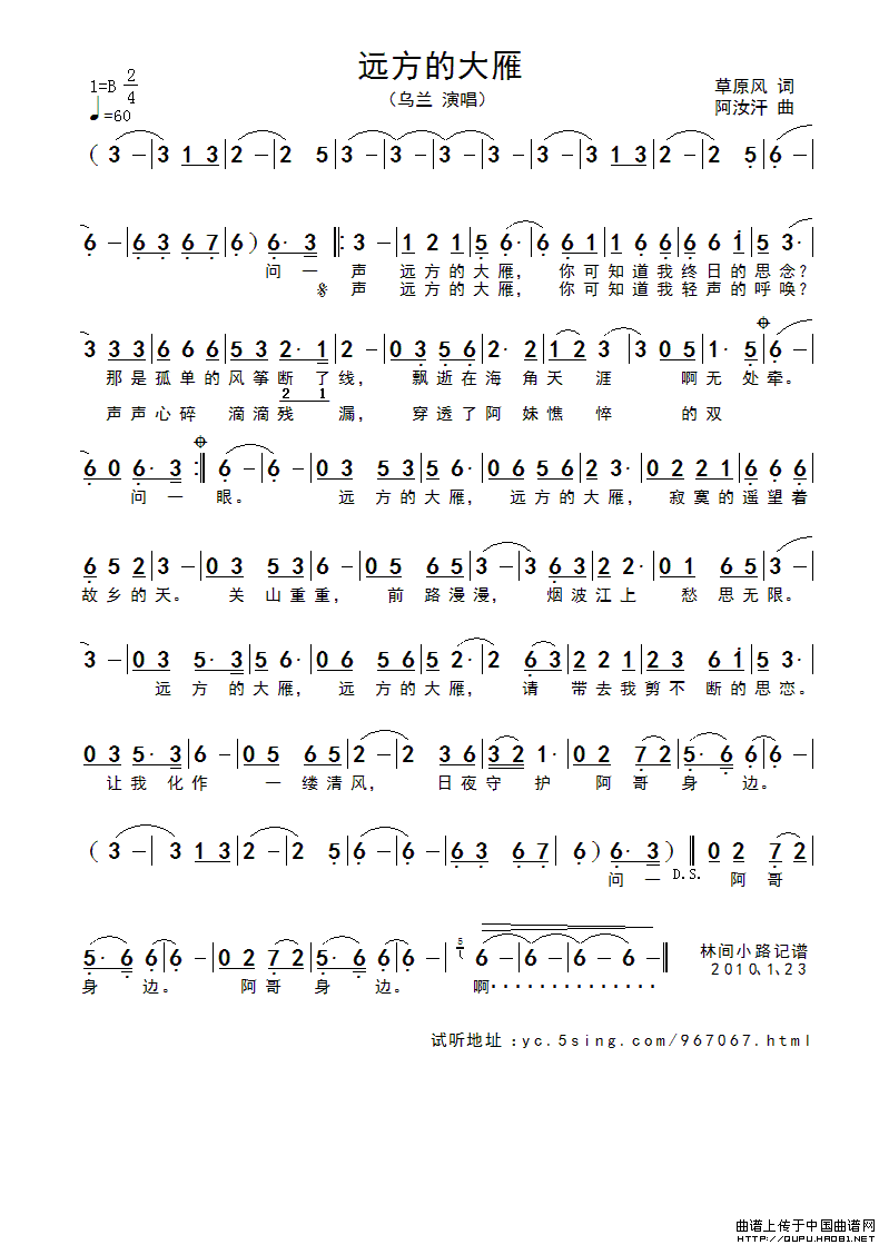 乌兰演唱的远方的大雁歌词,远方的大雁最新曲谱.