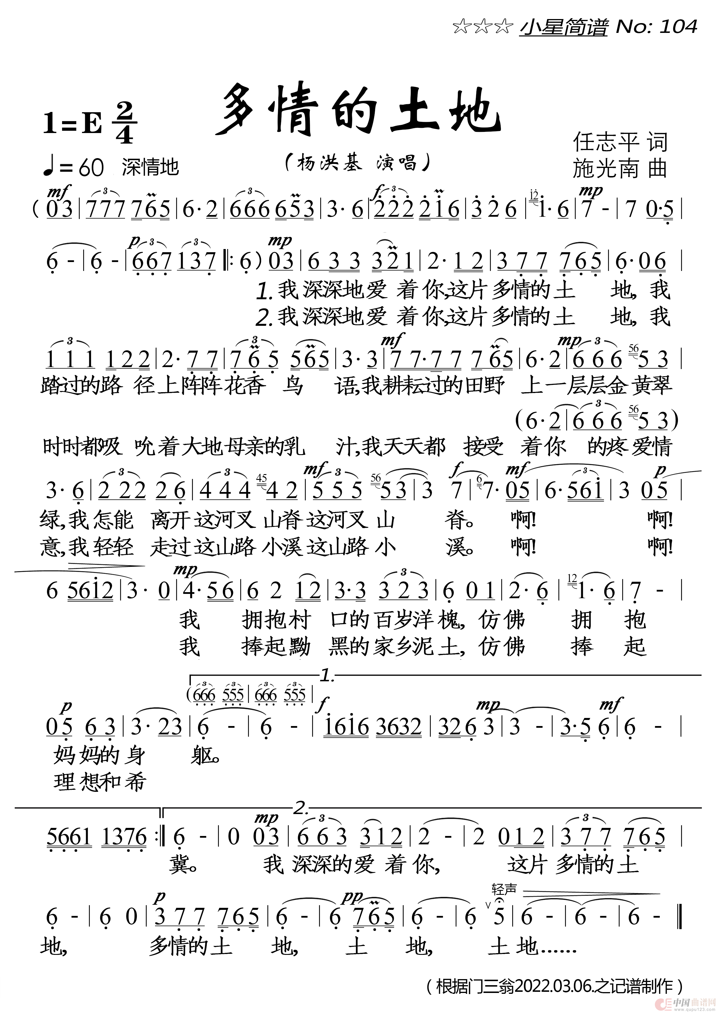 杨洪基演唱的多情的土地歌词,多情的土地最新曲谱.