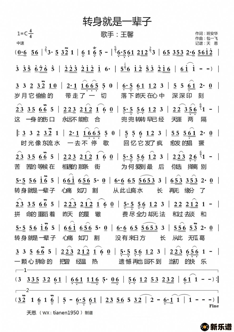 《转身就是一辈子》最新曲谱 王馨-天恩制谱