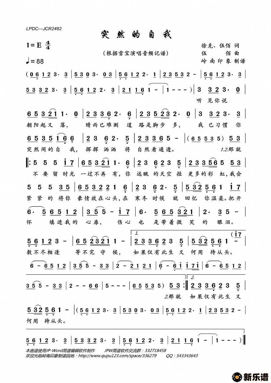 《突然的自我》最新曲谱 雪宝-岭南印象制谱