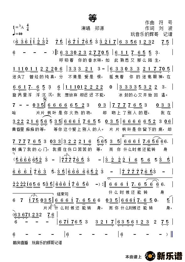 演唱 郑 源演唱的等歌词,等最新曲谱.