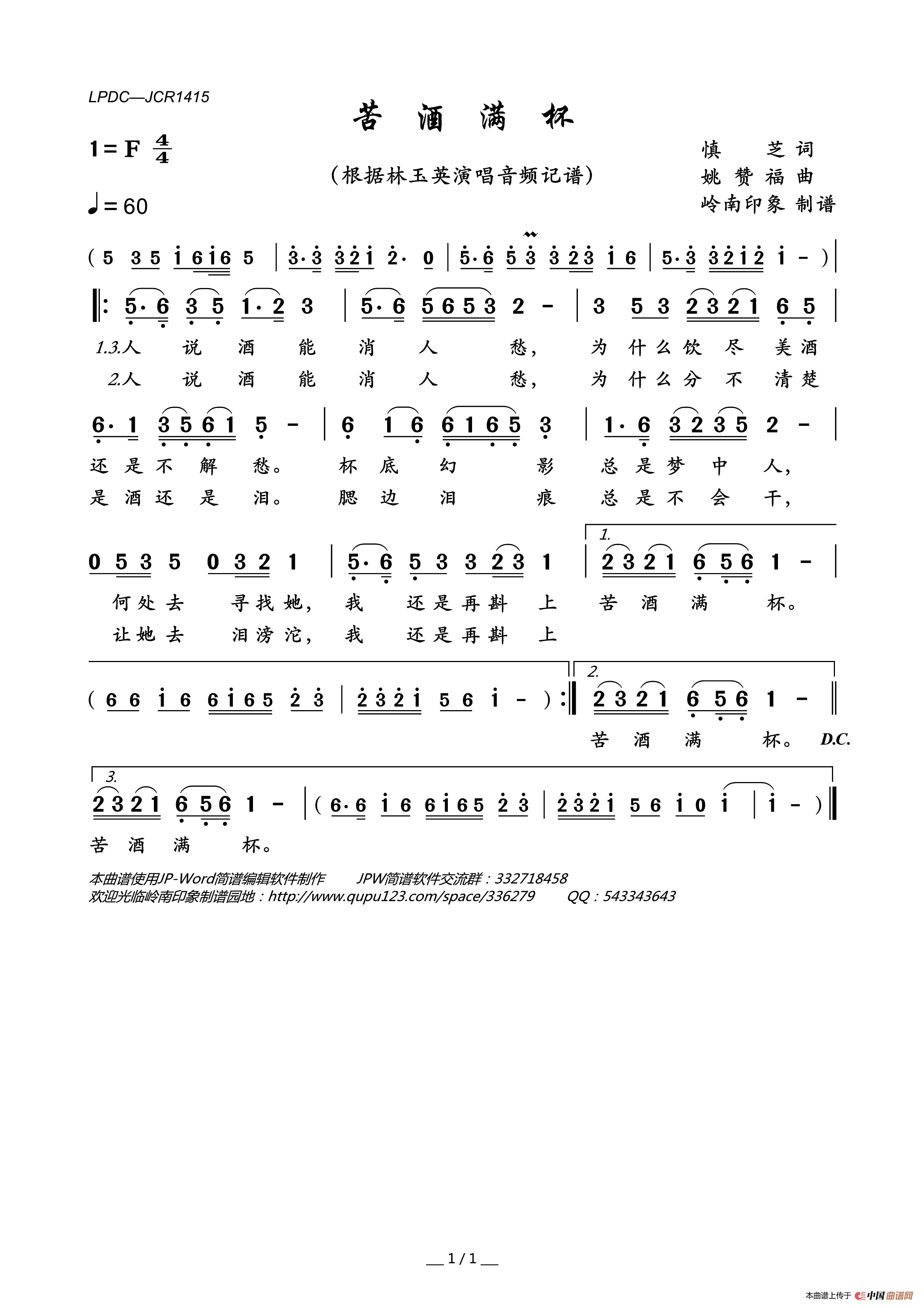 《苦酒满杯》最新曲谱 林玉英-岭南印象制谱