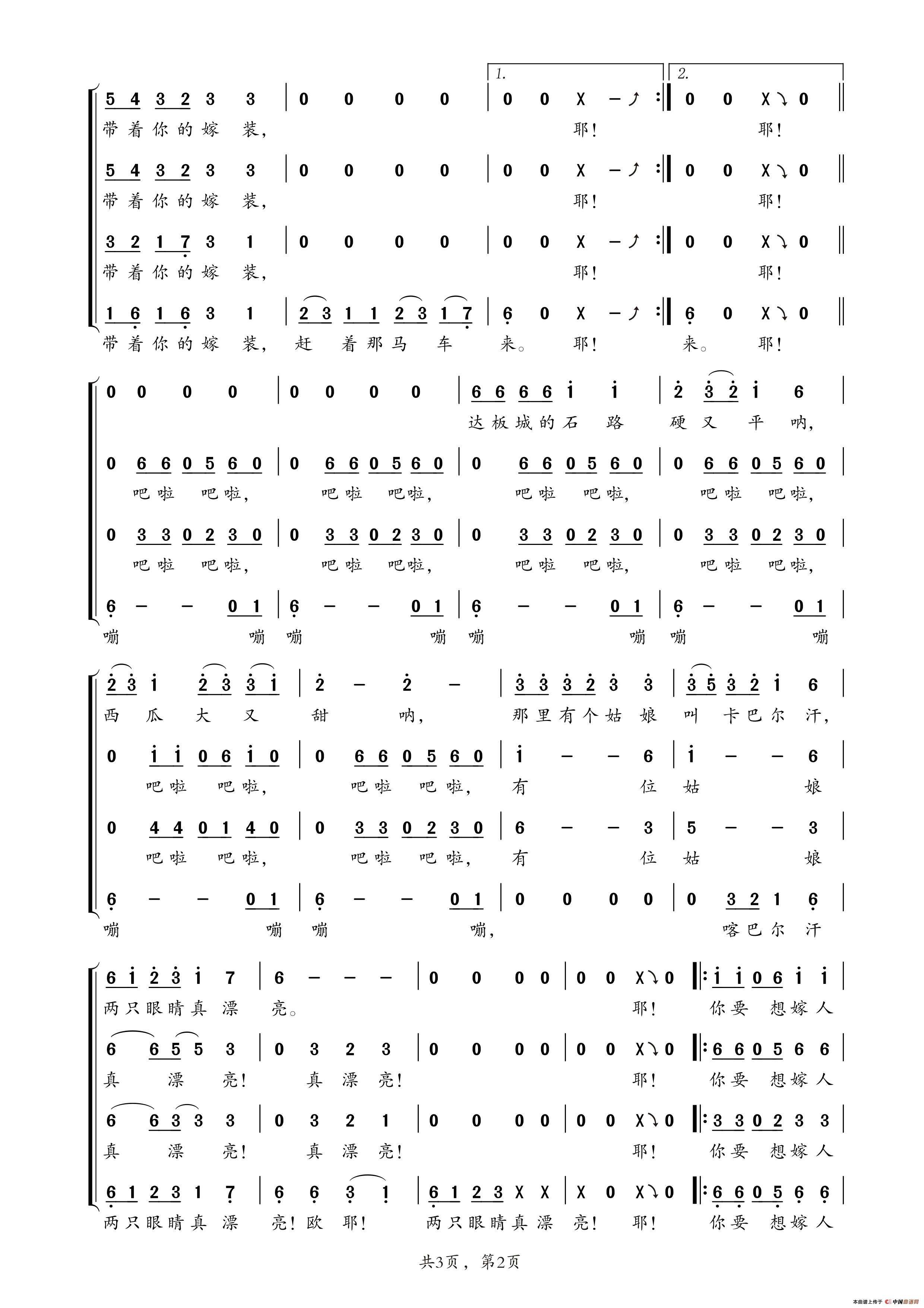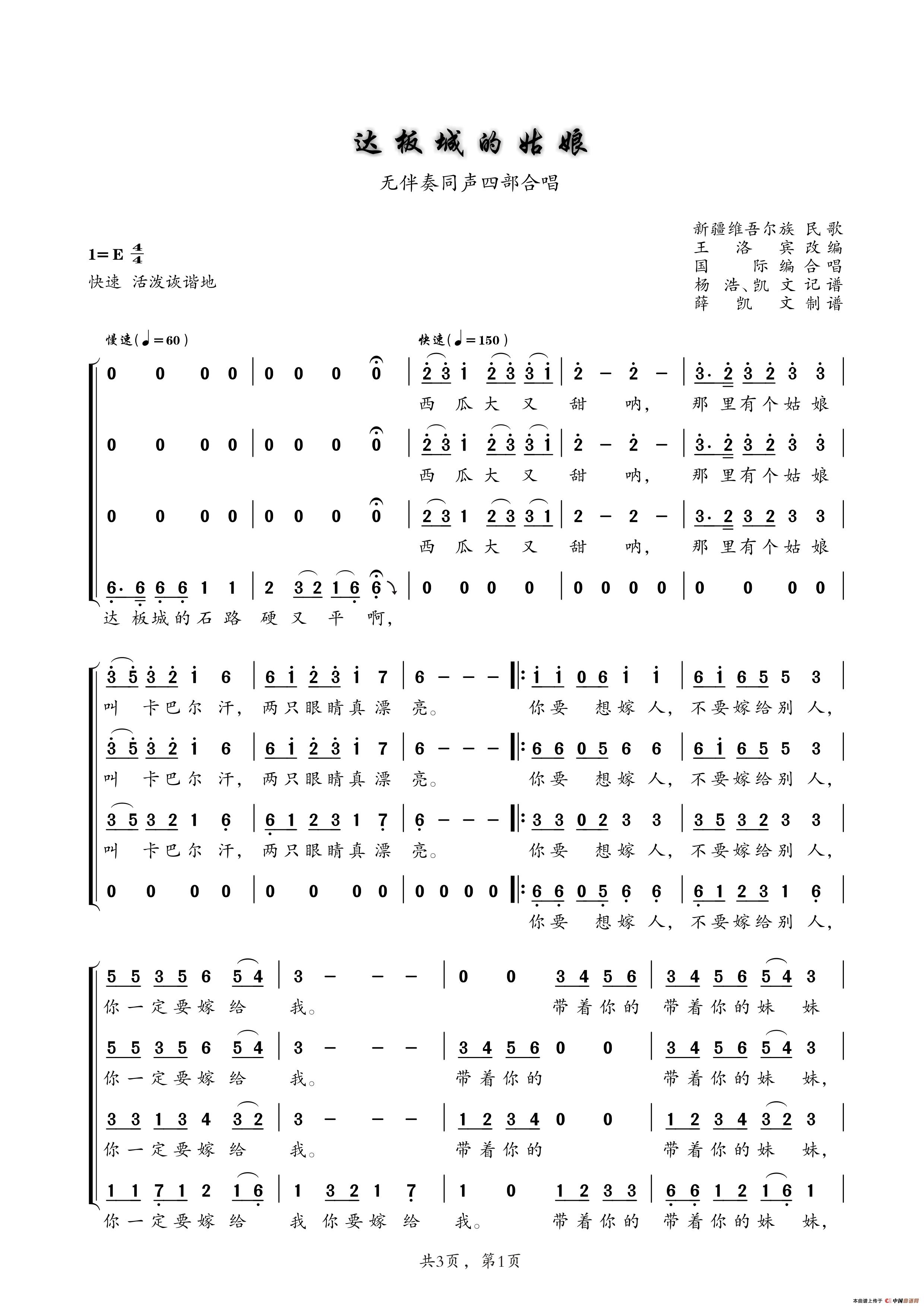 作词:新疆民歌 作曲:王洛宾改编、国际配合唱(同声四部合唱)