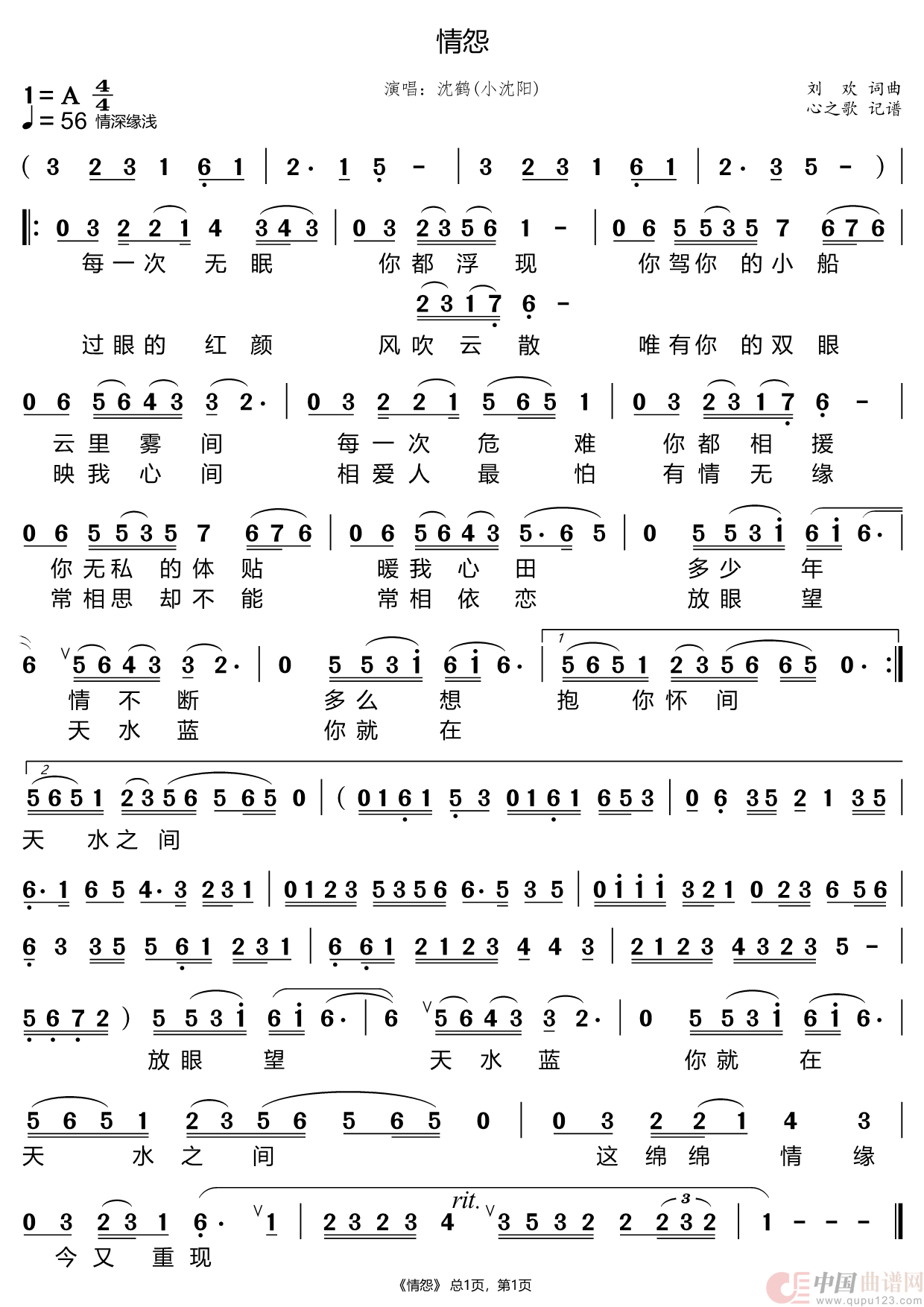 《情怨》最新曲谱 沈鹤-心之歌制谱