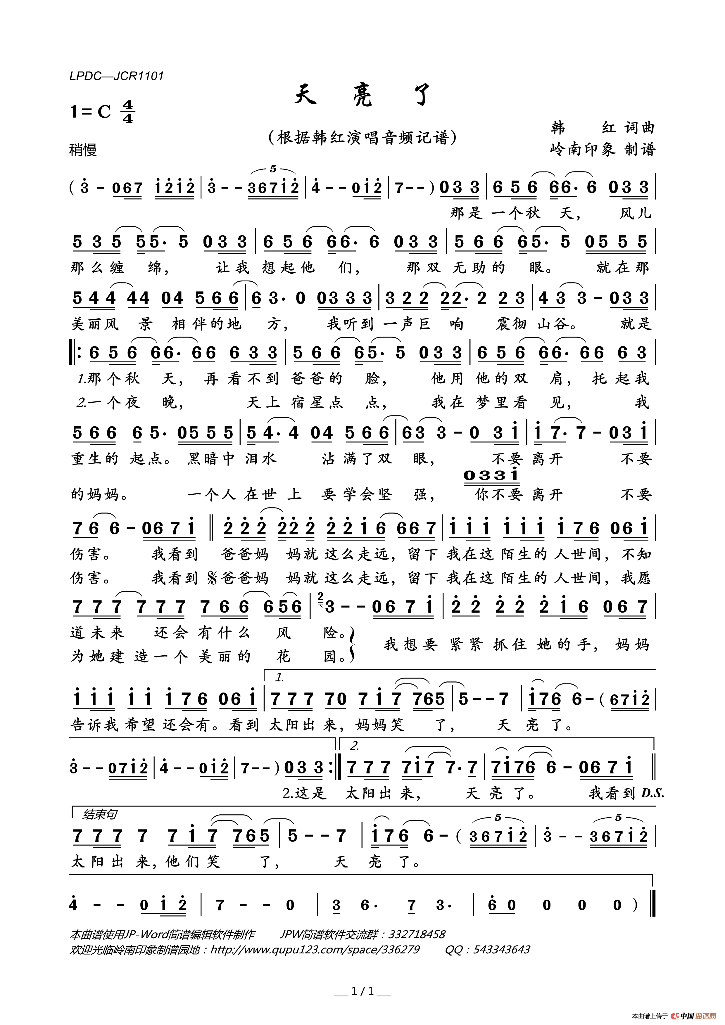 《天亮了》最新曲谱 韩红-岭南印象制谱