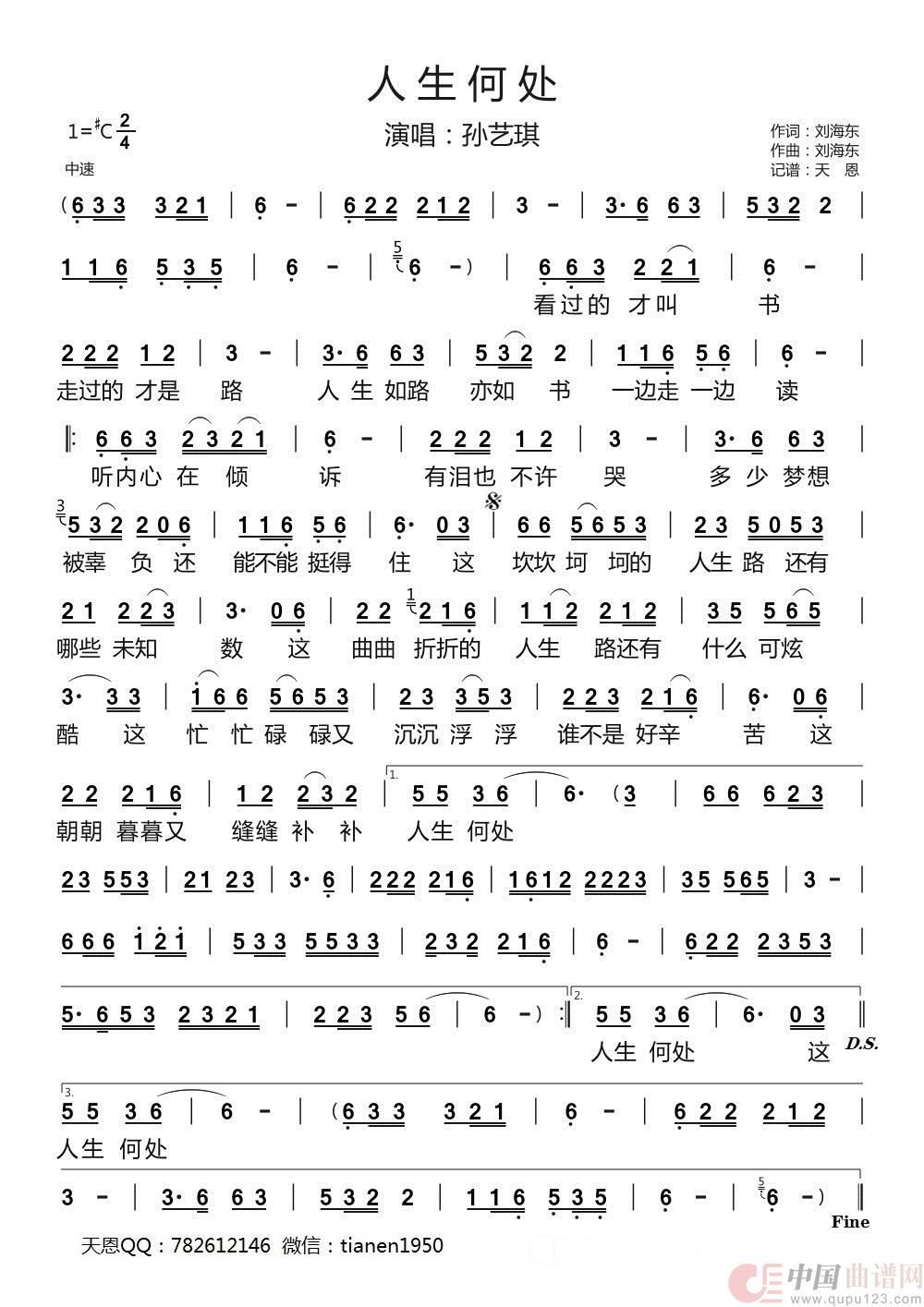《人生何处》最新曲谱 孙艺琪-天恩制谱