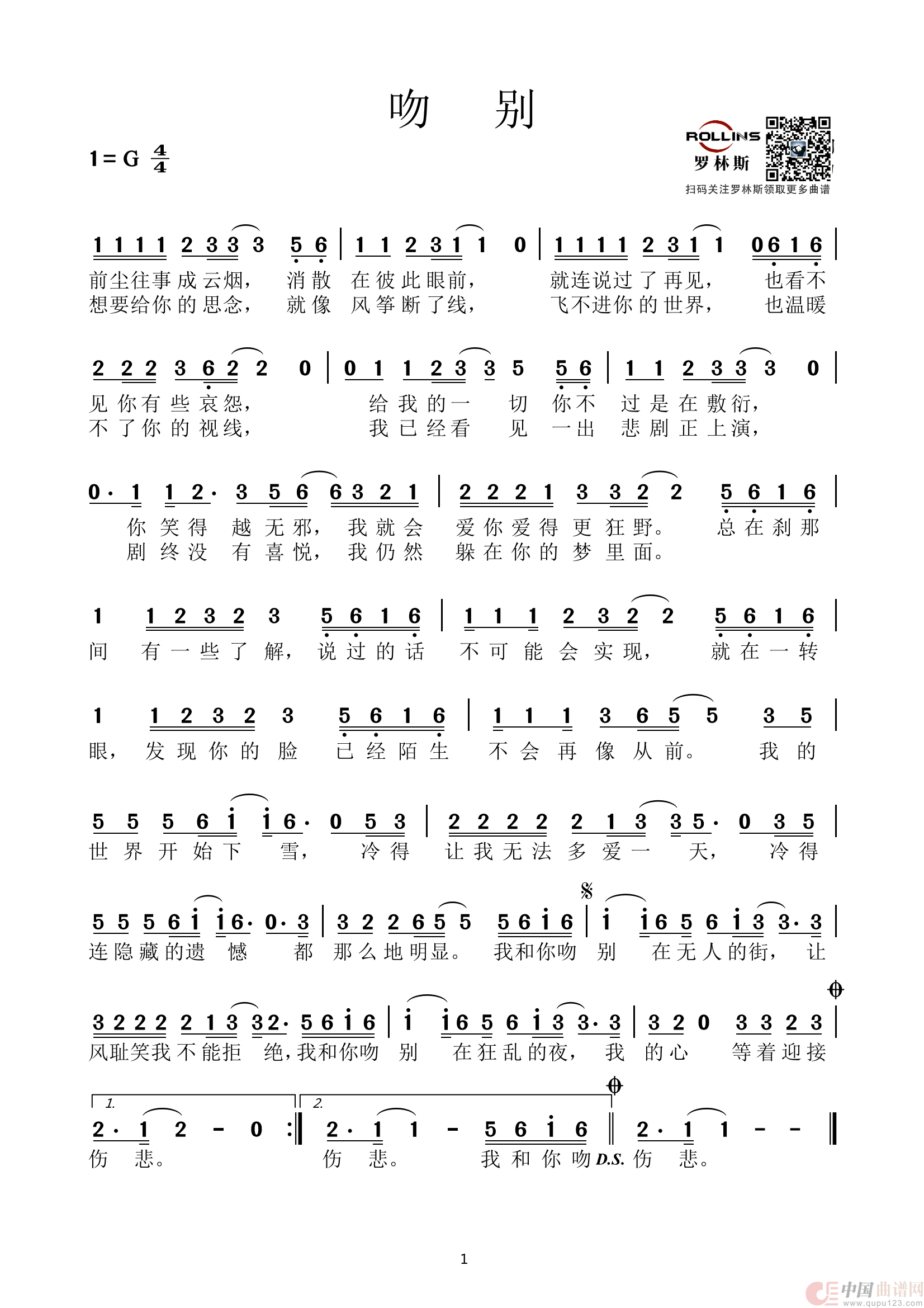 张学友演唱的吻别歌词,吻别最新曲谱.