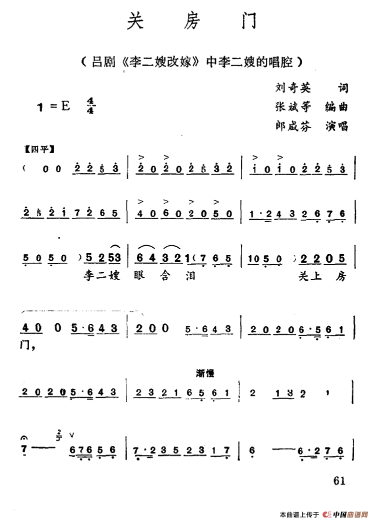 郎咸芬演唱的【吕剧】关房门歌词,【吕剧】关房门最新曲谱.