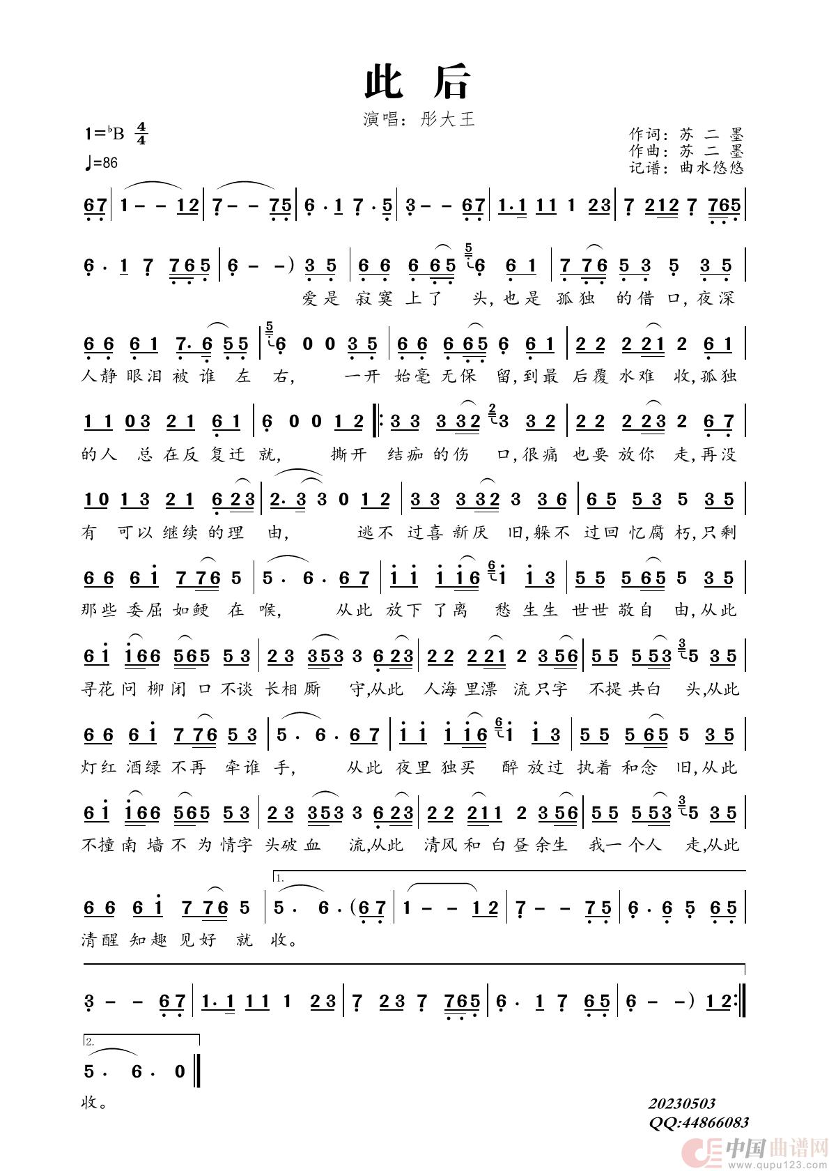 《此后》最新曲谱 彤大王-曲水悠悠制谱