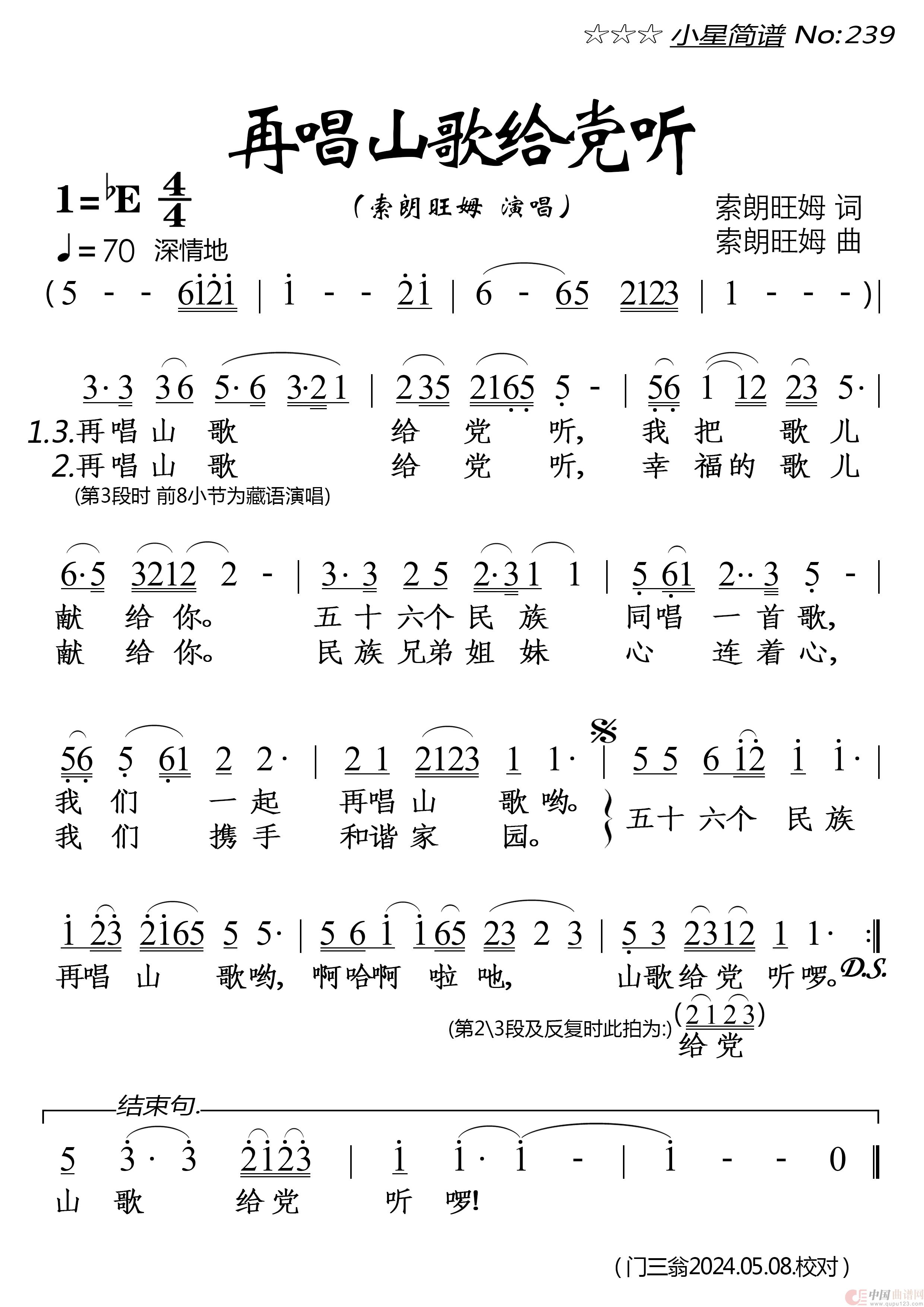 《再唱山歌给党听》最新曲谱 索朗旺姆