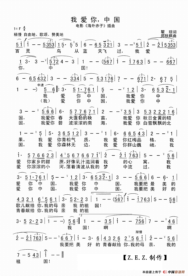 演唱的我爱你中国歌词,我爱你中国最新曲谱.